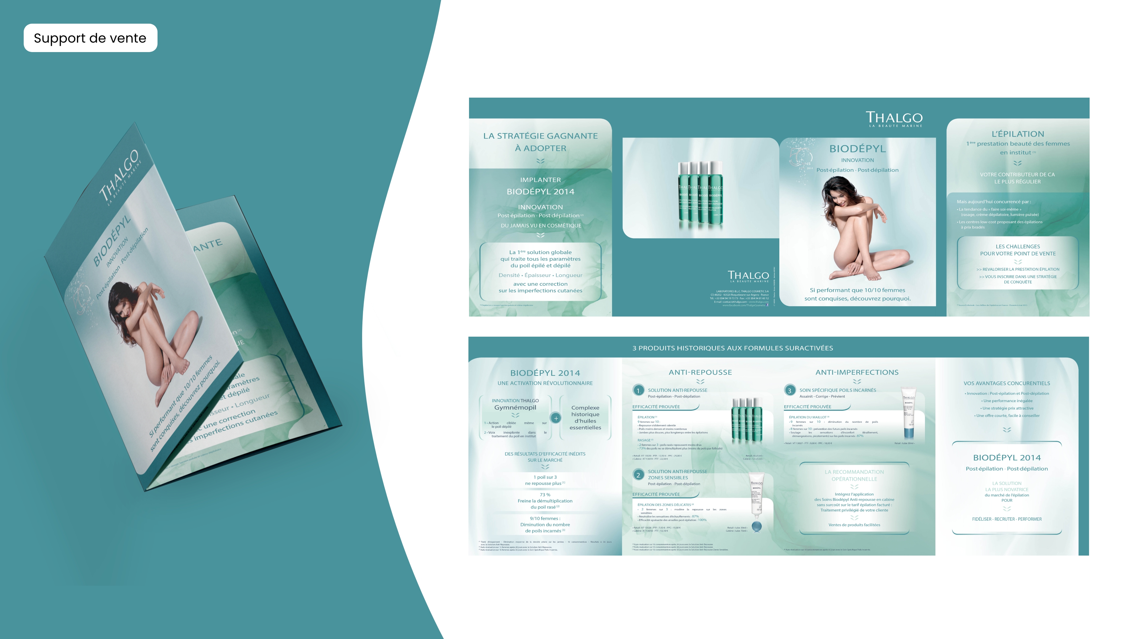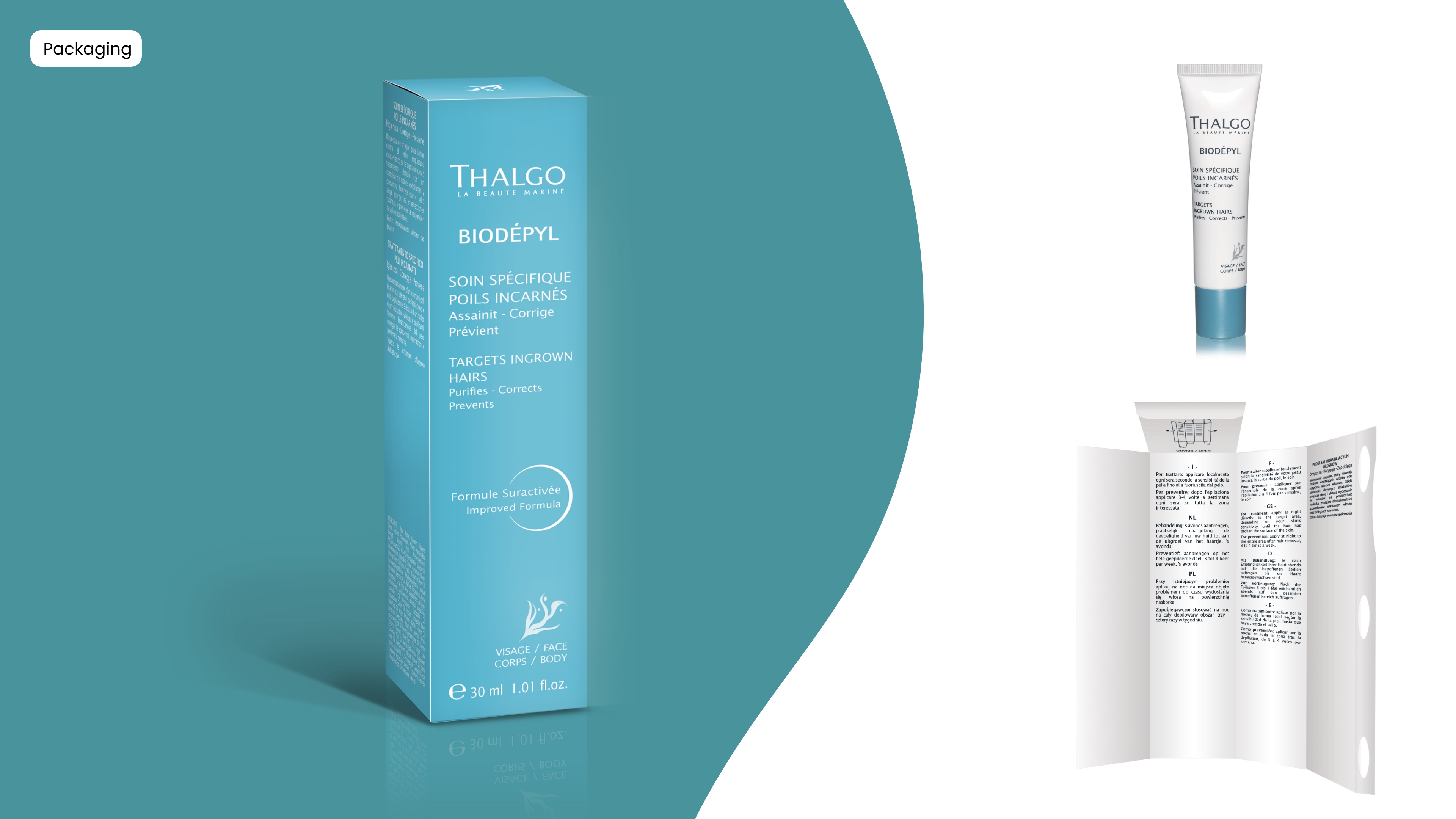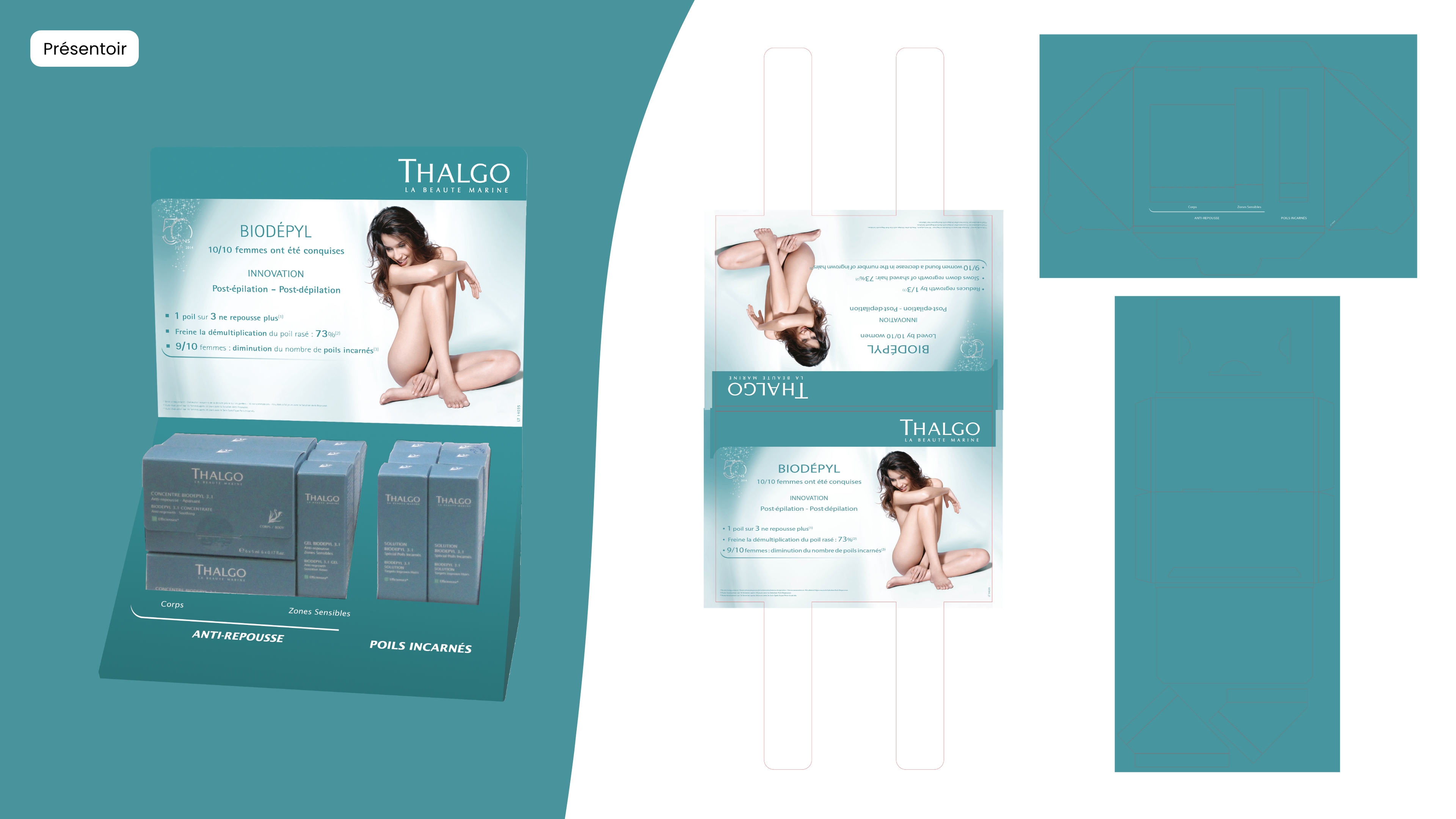 Pour la gamme Biodepyl de Thalgo, j’ai conçu le packaging primaire et secondaire des produits, en veillant à créer une expérience esthétique et fonctionnelle pour les consommateurs. J’ai également développé des présentoirs de mise en avant pour les points de vente, ainsi qu’un dépliant de support de vente destiné aux esthéticiennes, afin de les accompagner dans la promotion des produits au sein de leurs instituts.
